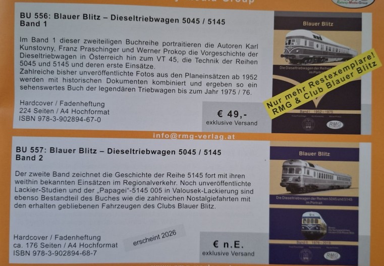 | Unser langjähriges Projekt dem „ Blauen Blitz“ ein Buch zu widmen ist als Teil 1 in der Endphase. Beim RMG-Verlag als BU 557 in 224 Seiten beginnend mit technischer Beschreibung und vielen schwarz/weiß sowie Farbbildern wird es am 18.06.2021 ausgeliefert. Es wird die Entwicklungsgeschichte mit gebauten, sowie vielen geplanten Ausführungen für das In- und Ausland vom Blauen Blitz gezeigt. z.B.: Doppelstock Planung, Syrien und Uruguay Ausführung etc. Bis 1975, werden in diesem Band die Einsätze im In- und Ausland gezeigt und auch bildlich dokumentiert. Auf „RMG-verlag.at“ unter der Rubrik Normalspurige Dieseltriebwagen stehen 7 Seiten Leseprobe zur Verfügung. € 49.-  | ||